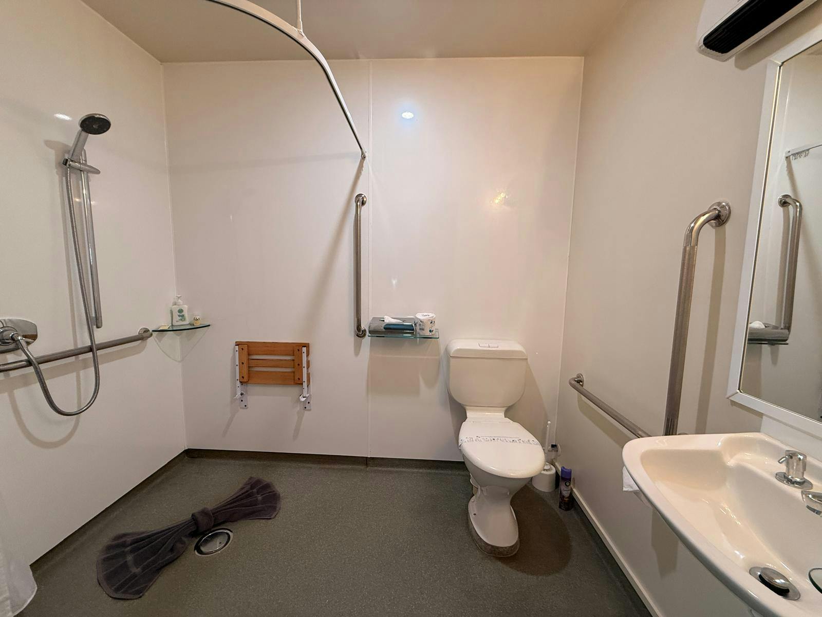 Deluxe studio room with wet floor shower, kitchen facilities, King and single bed, air conditioning, 40" HD LCD TV with Chromecast, comfortable leather arm chairs and work station. Suitable for wheelchair access. Free unlimited Wi-fi.