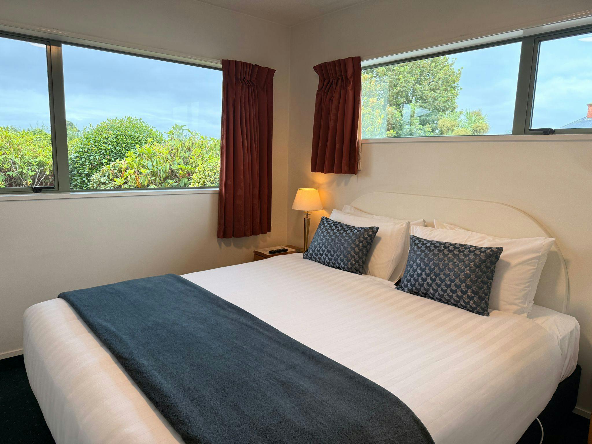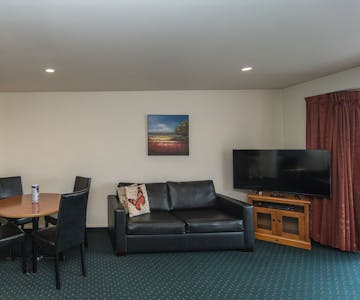 Spacious 2 Bedroom unit with air conditioning. King bed in each bedroom with a wall mounted LCD TV( 16 channels including 10 Sky Channels). Lounge has a leather couch and a second leather sofa that folds out to an extra bed. 50" LCD TV in lounge with 50+ Sky channels and Chromecast. Dining table and four chairs. Bathroom has double corner spa bath with a separate shower, toilet and vanity unit. Fully equipped kitchen including hob and oven. Free WiFi . Outside smoking area.